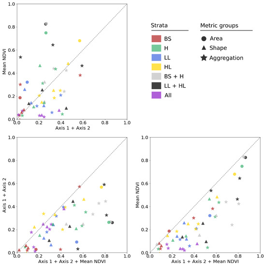 Comparison of coefficient of determination for window size of 100 m and different combination of predictive variables. For instance, for the top-left graph, points falling above the 1-to-1 line mean that models trained with only the mean NDVI had a higher than models trained with textural axis 1 and 2. A model’s color corresponds to its corresponding stratum and a model’s marker corresponds to its corresponding metric group.