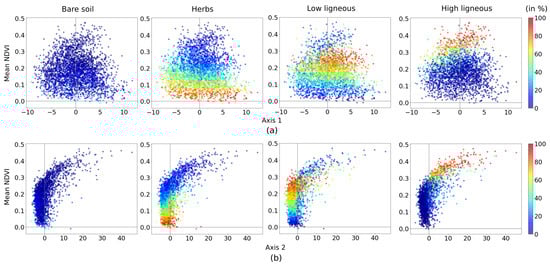 PLAND distribution in the 2D space defined by (a) texture axis 1 and mean NDVI and (b) texture axis 2 and mean NDVI.
