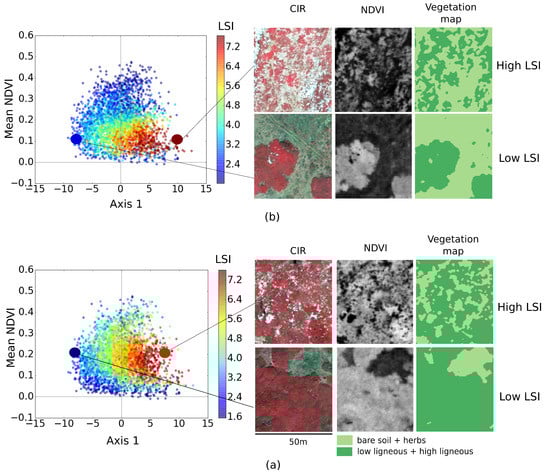 LSI distibution for (a) the grouped low ligneous and high ligneous strata and (b) the grouped bare soil and herbs strata on the 2D space defined by the first texture axis and mean NDVI. Particular windows of extreme LSI value are displayed on the right corresponding from left to right to colored infrared, NDVI, and vegetation map.