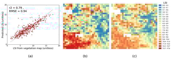 Inversion relationship between LSI of LL + HL computed from the vegetation map and LSI predicted by regression models for a window size of 100 m with (a) the inversion relationship plot; (b) LSI map derived from the vegetation map; and (c) LSI map derived the regression model. Blank areas correspond to masked vineyard and tree plantations. RMSE: root mean square error.