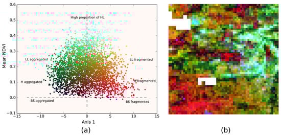 The information corresponding to the two textural indices and mean NDVI for each window was displayed as an image (with red, blue, and green colours corresponding to window scores for the first texture axis, second texture axis, and the mean NDVI value, respectively), in order to get a synoptic view of the spatial organization of vegetation structure. Figure 10a illustrates the resulting colours in the plane defined by the first texture axis and the mean NDVI, and Figure 10b shows the RGB composite image.