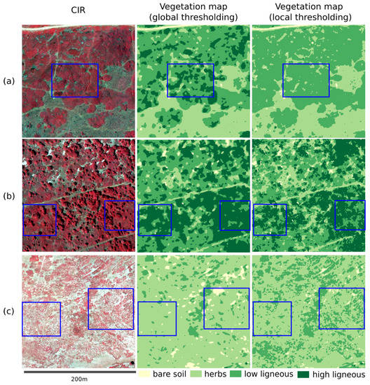 Classification using global thresholds showed an overall accuracy of 86.9% and a Kappa Coefficient of 0.818 (Table 3), with accurate identification of BS and H, whereas strong confusion between strata LL and HL was observed (37% of LL pixels misclassified into HL). This was expected given the distribution of NDVI for each class illustrated in Figure 3. The confusion between LL and HL was strongly reduced (commission error reduced to 14%) when using local thresholding (Table 4). However, the overall accuracy remained relatively similar. The definition of the LL stratum was particularly improved with local thresholding. Logically, the classification accuracy reached more than 99% classification accuracy when combining H with BS, and LL with HL (Table 5 and Table 6).
