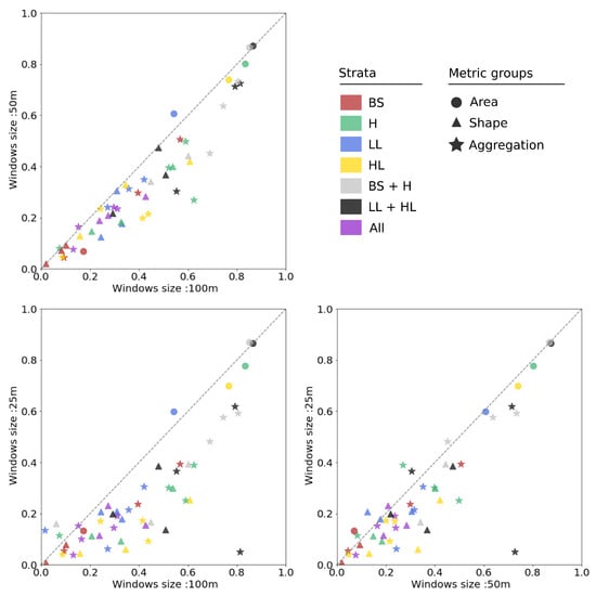 Various landscape metrics were computed with FRAGSTATS 4.2.1. software. The metrics were computed with a specific window size N for each stratum or combination of stratum (BS + H and LL + HL) individually and for all strata considered together (called “landscape level” in FRAGSTATS). FRAGSTATS enables the computation of a large number of metrics for categorical landscape patterns. These metrics are grouped according to landscape pattern features. This study focused on three main groups, corresponding to area, shape, and aggregation metrics []. Some of these metrics show strong collinearity, in particular metrics from the same class [,]. In order to minimize redundancy and computational cost, a correlation analysis was performed to select a limited set of uncorrelated metrics from each group of metrics. The final selection resulted in one area metric, three shape metrics, and five aggregation metrics. Area metrics are related to the proportion of a stratum in the landscape with no information on its spatial distribution. Shape and aggregation metrics are related to landscape configuration; the former in terms of the complexity of patch shape, and the latter in terms of spatial aggregation of the same patch type. Table 2 lists all the selected indices of landscape patterns. The landscape metrics were computed with the vegetation classes delineated applying the eight neighbours rule. Each window was analyzed separately, and the window boundaries were not counted as edges.