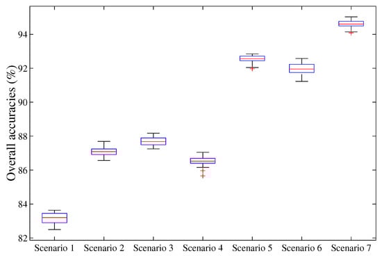 Overall classification accuracies with different input feature scenarios. The red line inside the box represents the median. The bottom and top of the blue boxes are the first and third quartiles. As for the whiskers, the lowest datum represents the lowest value still within 1.5 IQR (IQR = third quartile—first quartile) of the lower quartile, and the hightest datum represents the highest value still within 1.5 IQR of the upper quartile. Red crosses indicated the outliers.