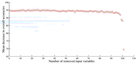 To evaluate the contribution of each variable to the map accuracy, the number of input variables was subsequently reduced on account of the least importance ranking scores, and the corresponding overall classification accuracy was calculated (Figure 5). From the figure, it can be seen that the overall map accuracies tended to decrease slightly when the first 92 lowest important features were removed. However, the overall accuracies began to fall off rapidly when the remaining 10 most important features are eliminated one by one.
