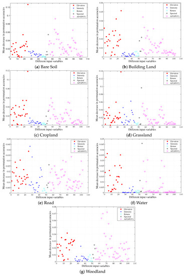 Figure 6 illustrated the relative importances of all available variables for each land cover class. What we can discover from this figure is that the per-class variable importance varied in a large extent. Regarding the bare soil class (Figure 6a), the most important features involved in height features were nDSM and variance, SPOT-5 SWIR band and some spatial features. However, LiDAR-derived intensity and multiple-return features were not very relevant for the classification of bare soil class. As far as the building land class is concerned (Figure 6b), high values of importances were focused on the elevation and spatial variables. The nDSM belonging to height features exhibited an extremely high value of relevance in terms of the cropland class (Figure 6c). Furthermore, it is worth noting that LiDAR-derived intensity and multiple-return features seemed to be less valuable than other kinds of variables. As for the grassland class (Figure 6d), the features with higher values of importances covered all types of variables except multiple-return features. The feature relevances were more dispersed between height, intensity, spectral and spatial features for road class, which makes the road class more difficult to be distinguished (cf. Table 2). As shown in the (Figure 6f), the SPOT-5 SWIR band played the most important role in discriminating the water class. In addition, some of the height and spatial features also contributed greatly to the classification of the water class due to the higher relative importances. As for the woodland class (Figure 6g), the dominating features concentrated mainly on height and spatial features, among which the most important variables were the spatial features derived from SPOT-5 image.