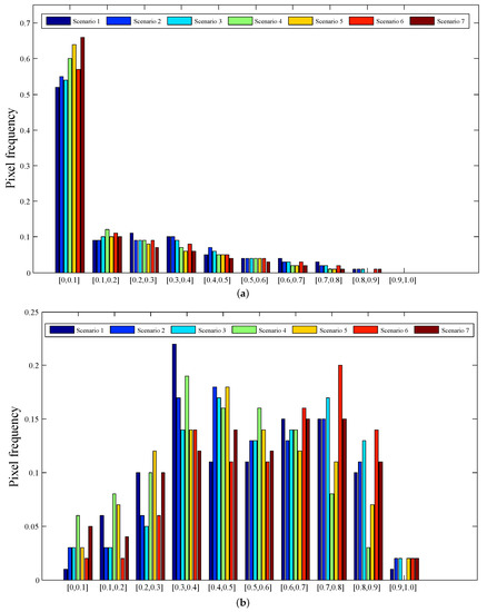 The frequency distribution of H was calculated for the incorrect and correct predictions as shown in Figure 7, and the mode of these distributions was discussed. As far as the correctly classified pixels are concerned, a high proportion of pixels were assigned to low values within the [0, 0.1] interval, and fewer correct predictions were associated with an uncertainty H above 0.5. This illustrates that a majority of correctly classified pixels were characterized by lower classification uncertainty, meaning that there was little doubt about the final classification result. Two observations are worth noting. First, correct predictions mostly had low uncertainties, independent of the input feature scenarios. Second, combining SPOT-5 and LiDAR gave rise to a higher proportion of low uncertainties in comparison with the single data alternatives, namely, the integration of SPOT-5 and LiDAR data decreased the uncertainty of classification (Figure 7a). A very large proportion of incorrectly classified pixels yielded the uncertainty values lying within the interval [0.3, 0.9]. This implies that the class decision was uncertain if the mode voted for the incorrect class. Moreover, it was observed that there was a large difference between the seven scenarios of input variables (Figure 7b).