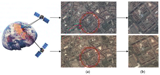 Appearances of two video clips shot of the same location at different time by two different satellites. (a) A sample frame taken from each of the video clips; the same structure indicates the same location. (b) Magnified area showing the variances in projection, color, and quality.