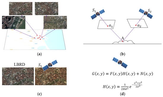 Sketch of the long-term background referencing library (LBRL) for long-term background redundancy (LBR) elimination. (a) Corrected historical images registered at corresponding locations in the scale of a smart city, forming the foundation library of the LBRL; (b) projection transformation; (c) radiometric adjustment; (d) quality adjustment.