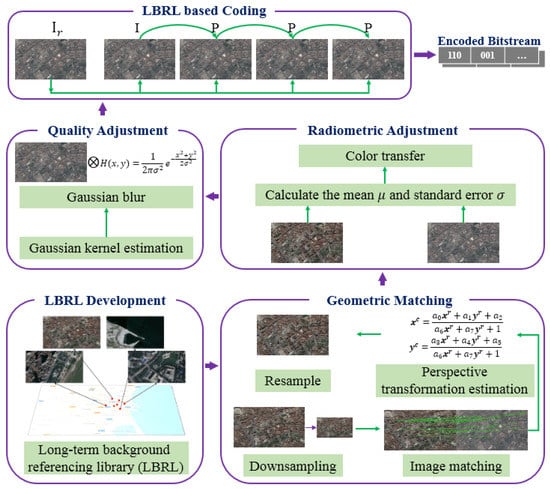 This section first details how to generate references from an LBRL for a newly collected video clip through geometrical matching for projection transformation, radiometric adjustment, and quality adjustment of the background image. Then, it describes the encoding and decoding scheme based on a generated background reference. An overview of the proposed LBRL-based EOVD coding framework is illustrated in Figure 3.