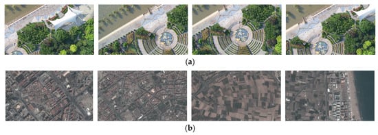 Video clips from satellites: Four video clips from satellite Jilin-1 over Valencia, Spain were used in the experiment (Figure 5b), containing two video clips of building, one of farmland, and one of seaside areas. To facilitate the coding process, we did not directly use the original 12,000 Γ 5000 resolution, but cut out video clips with a of size 1080p with 300 frames, 15 fps. As access to the historical satellite data was limited in our experiments, images from Google Earth [15] were employed as the LBRL images. The Google Earth images were already geographically registered images with high resolutions.