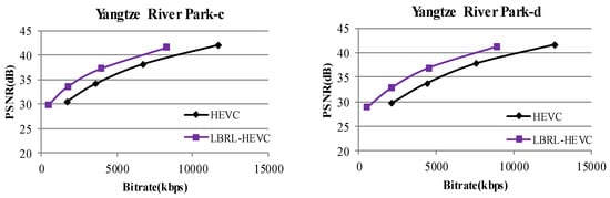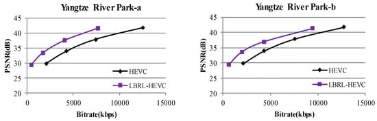 As shown in the pictures, if encoded at nearly the same bitrate, the LBRL-based methods can provide better visual quality than that achieved from the corresponding codec. Comparing different decoded pictures from the same frame, the visual qualities were consistent with the PSNR values; namely, lower PSNR corresponded to lower visual quality. LBRL-HEVC can provide almost the same result visually as the original frame, especially that for Seaside with 39.25 dB. When the quality degraded to 35β37 dB from HEVC, decoded pictures tended to be blurry. Since the compression ratio is lower in LBRL-x246 and x264, the qualities of the decoded pictures were obviously lower than those from HEVC. We can clearly notice the blocking artifacts in the pictures from x264. Taking the cars on the road in the Seaside video clip as an example to clarify the visual comparison, we can count six cars from the original picture. After encoding by LBRL-HEVC, five were remained, whilst only four cars were left in the decoded picture from HEVC. The shape of the cars became blurry in LBRL-x264, but we can still count five cars. The cars had almost disappeared from in the picture from x264.