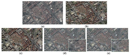 Reference images. (a) Sample frame from satellite video clips building-1; (b) cropped image from a large image downloaded from Β© Google Earth; (c) reference image after geometric matching; (d) reference image from after radiometric adjustment; (e) final background reference image from after quality adjustment.