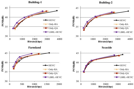 The RD curves for the tested satellite video clips are shown in Figure 9, revealing results similar to those we obtained from Table 2. The RD curves for Only-RA and Only-QA almost overlapped with HEVC, showing no significant improvement. The curves for the proposed method were higher than the other curves for the four video clips, representing the general effectiveness of the proposed method in bitrate reduction for satellite videos.