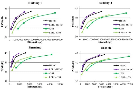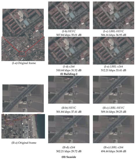 The detailed results are plotted in Figure 10, together with the curves of LBRL-HEVC and HEVC. As shown in the curves of x264 and LBRL-x264, the differences between them were bigger at the lower part than the higher part. The lower part of the curves covered the range of the selected bitrate for transmission, where obvious bitrate reduction can be observed. More details are shown in the visual results in Figure 11. We can also notice that the bitrates from HEVC were much lower than the results from LBRL-x264 or x264. However, the HEVC-based codecs cannot be implemented on UAV or satellite platforms, due to the computational complexity presented in Section 5.4.