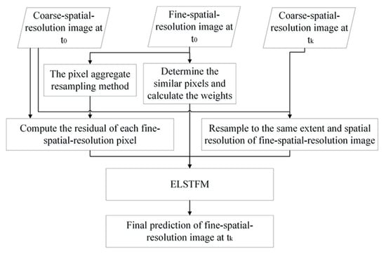 In practice, two coarse-spatial-resolution images obtained at the reference date (t0) and prediction date (tk) as well as one fine-spatial-resolution image acquired at t0 are necessary for fine-spatial-resolution image prediction. ELSTFM implementation mainly contains three steps: (1) the fine-spatial-resolution image at t0 is first resampled to the same spatial resolution of coarse-spatial-resolution image by utilizing the aggregate resampling approach, then the residuals of fine-spatial-resolution pixels can be computed based on Equations (10) and (11); (2) for a given fine-spatial-resolution pixel, the neighboring similar pixels and their corresponding weights are calculated, and the coarse-spatial-resolution images at t0 and tk are resampled to the same spatial resolution of the fine-spatial-resolution image; and (3) the ELSTFM is utilized to synthesize the final fine-spatial-resolution image at tk based on Equation (6). The flowchart of the ELSTFM is shown in Figure 1.