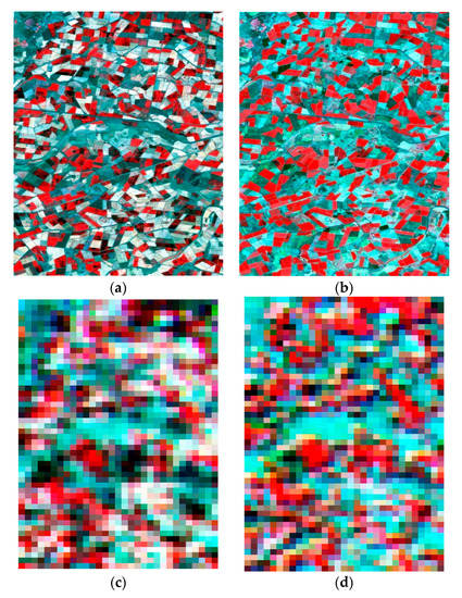 Test data of site 2: Landsat-7/ETM+ images (384 × 592 pixels) acquired on (a) 17 May 2001 and (b) 2 June 2001 as well as 8-day composite MODIS images resampled to 480 m resolution (24 × 37 pixels) acquired on (c) 17 May 2001, and (d) 2 June 2001. All images used NIR–red–green as RGB and identical linear stretches.