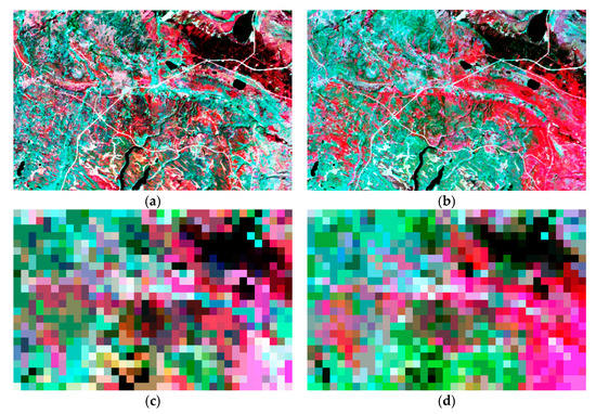 The second site was located in Canada (54°N, 104°W), covering an area of approximate 11.5 × 17.7 km2 (384 × 592 fine-spatial-resolution pixels), where the growing season is short and phenology changes are extreme []. The major land-cover in this region is forest, with subsidiary fen and patches of sparse vegetation (soil, rock, burn scars). This site has been used to validate the STARFM method and can be regarded as a homogenous area. The NIR–red–green as the RGB composite of the Landsat-7/ETM+ images and their corresponding MODIS images are shown in Figure 3. Two Landsat-7/ETM+ images (Path/Row 36/22) acquired on 17 May (Figure 3a, used as input fine-spatial-resolution image) and 2 June 2001 (Figure 3b, used to validate the experimental accuracy) with six bands (the 1st–5th bands and the 7th band) utilized. Additionally, the two input MOD09A1 images (h11v03) with six bands (the 1st–4th bands and the 6th and 7th bands) at the reference and prediction dates were acquired on 17 May (Figure 3c) and 2 June 2001 (Figure 3d), respectively.