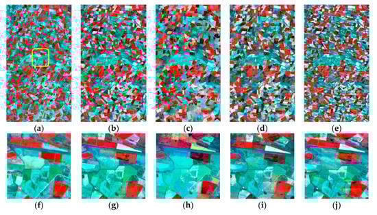 Results obtained from the (b) ELSTFM algorithm, (c) Fit_FC algorithm, (d) FSDAF algorithm, and (e) STARFM algorithm for site 2 (NIR, red, green bands as RGB) on 2 June 2001. (a,f) are the actual Landsat-7/ETM+ image and the subarea marked in yellow on 2 June 2001. (g–j) are the corresponding results on 2 June 2001 for the subarea marked in yellow in (a).