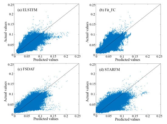 We used the first band (blue band) of the Landsat-7/ETM+ data as an example to analyze the differences between the predicted values and actual values pixel-by-pixel. As shown in Figure 5, the scatter plots by the four methods confirmed that the values predicted by ELSTFM and Fit-FC seemed to be more accurate than the other two methods, which corresponded to the statistical results (Table 2) that ELSTFM and Fit-FC were the better fusion methods for the objective image. However, when compared with the other three methods, the ELSTFM could best predict the lower reflectance values, which can partly explain the best fusion accuracy obtained by ELSTFM method.
