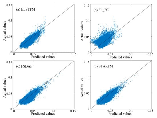 Scatter plots of actual and predicted values obtained by using (a) ELSTFM; (b) Fit_FC; (c) FSDAF; and (d) STARFM for the blue band of Figure 6a, and the line is the 1:1 line.