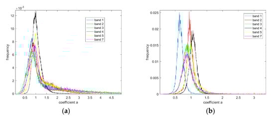 The slope of the linear model formed using Landsat and MODIS data should be close to 1 because these two datasets are consistent and comparable after the same atmospheric correction process [,]. Hence, in this part, we checked the distributions of the slopes of all six bands for two study sites to validate the ELSTFM indirectly. According to Equation (2), the slope of a pixel (m, n) can be calculated as: