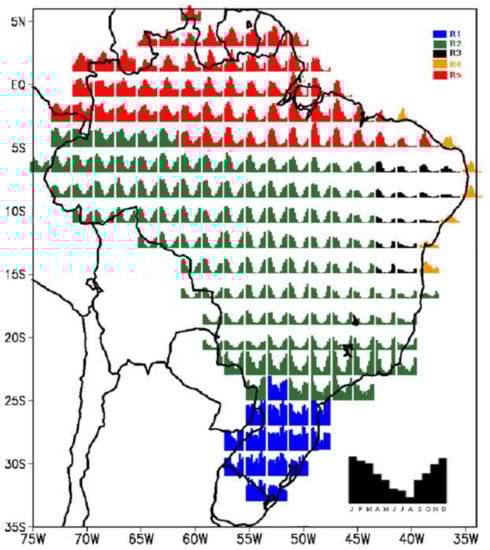 - Reboita, M.S.; Gan, M.A.; da Rocha, R.P.; Ambrizzi, T. Regimes de precipitação na América do Sul: Uma revisão bibliográfica. Rev. Bras. Meteorol. 2010, 25, 185–204. [Google Scholar] [CrossRef]