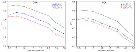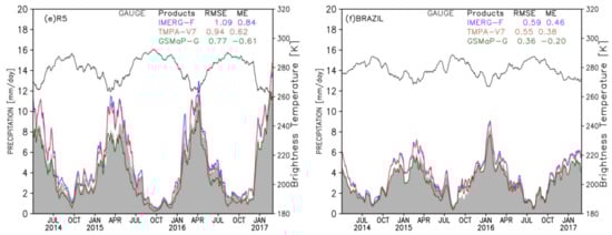 - Using the position (latitude and longitude) of each station, satellite-based precipitation retrievals are extracted from TMPA-V7, IMERG-F and GSMaP-G products using the nearest neighbor approach (the closest center of the correspondent grid point is selected). This approach is the same as that used in [11] to retain the original retrieved value of each algorithm. In this case, the maximum distance between the center of the grid point and the gauge is approximately seven kilometers for IMERG-F and GSMaP-G, and eighteen kilometers for TMPA-V7 (below the nominal spatial resolution of the respective products);