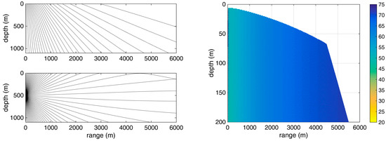 Figure 2 shows the predicted geometry of direct acoustic rays from a source at a depth of 160 m, as well as their surface-reflected continuation, in this environment. Both direct and surface-reflected rays provide a nearly homogeneous coverage. The graph on the right shows the area (in color) where the TDOA between direct and surface-reflected arrivals is larger than 7 ms, such that these arrivals are well separated in time. The longer the distance, the deeper the hydrophones have to be in order to avoid overlap between direct and surface-reflected arrivals, e.g., at a range of 1500 m the hydrophone has to be deeper than 60 m to receive distinct arrivals. The different colors denote the ray-theoretic transmission loss (TL) in dB according to the scale given on the right—in this calculation the frequency-dependent absorption was not taken into account such that the results are independent from frequency. From the figure, it can be seen that the TL closely follows the spherical spreading law [24], whereas at ranges beyond ~1 km the effects of refraction in the form of weak ripples can be seen.