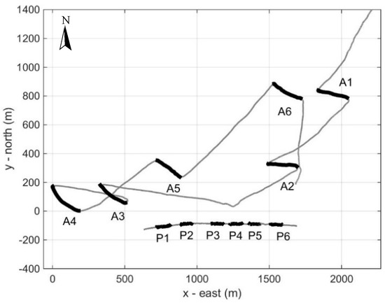 Figure 6 shows the track of the vessel towing the hydrophone array and also the track of the surface buoy from which the pinger was suspended during the shallow-water experiment on 15 December 2014. The experiment took place in an area with water depth between 140 and 180 m, with good weather and sea state between 1 and 2. The pinger was suspended at a depth of 160 m and was deployed in an area of about the same water depth (as measured by the boat echo sounder), such as to avoid bottom reflections. The vessel and the buoy/pinger locations during the experiment were tracked by the Astro GPS central and peripheral unit, respectively. After the deployment of the pinger the boat moved away and the hydrophone array was released to start the localization. Six stations were held, denoted by A1 to A6 in Figure 6; the corresponding locations of the buoy attached to the pinger are marked by P1 to P6. It is seen that at each station there was a strong drift of the boat to the east/southeast, at a speed of ~1 kn (~0.5 m/s). Due to the strong current the buoy/pinger also drifted, approximately along the 160-m isobath, even though the pinger touched the bottom; traces of dragging (abrasions) as well as mud remains were observed on the pinger after its retrieval.