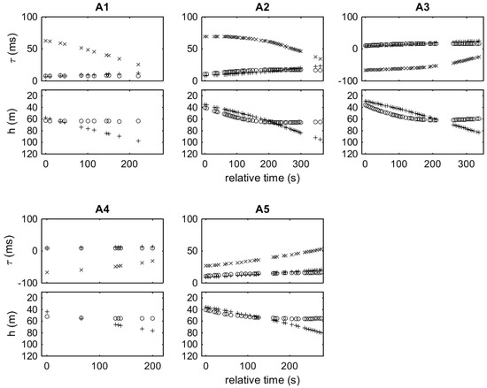 Figure 7 shows the TDOAs at the two hydrophones and hydrophone depths at stations A1 through A5. The acoustic signals at station A6 were of poor quality, mainly because of the presence of an approaching trawler (noise increase) but possibly also due to signal degradation caused by sinking of the pinger in mud or by the bottom topography around the pinger. The present localization approach is sensitive to SNR in two ways, in connection with both signal detection and travel-time estimation accuracy. Both detection capability and travel-time accuracy deteriorate with decreasing SNR, as described by the passive sonar equation [25] and the Cramér–Rao lower bound [25,26], respectively. For signal detection and arrival time estimation bandpass filtering was used focusing on the frequency band between 10 and 12 kHz and, further, matched filtering (correlation with a replica of the emitted signal) was applied. For each reception, the TDOAs refer to the time difference between direct and surface-reflected arrivals—surface-reflected arrival time minus direct arrival time—for the front (circles) and rear (crosses) hydrophones, as well as the time differences between direct arrivals at the two hydrophones (x symbols)—arrival time at the rear hydrophone minus arrival time at the front hydrophone. The same symbols (circle for the front, cross for the rear hydrophone) are used for the hydrophone depths.