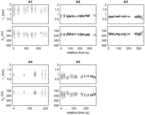 Localization results for source range (from front hydrophone) and source depth during stations A1–A5 of the shallow-water experiment. The error bars about the estimated means (◦) indicate the posterior RMS errors. The dashed lines represent the anticipated pinger depth (160 m). The framed results at station A1 correspond to the averages of individual estimates.