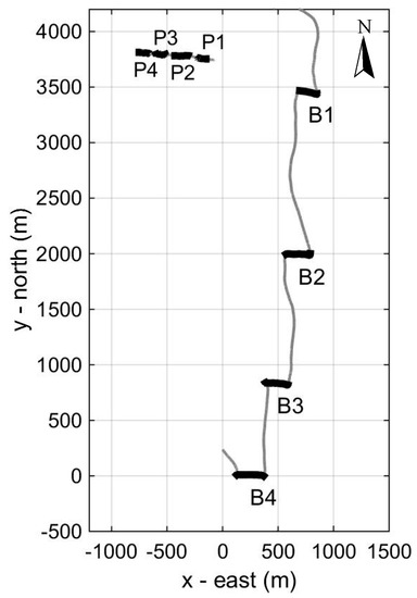 Figure 9 shows the track of the vessel and the buoy from which the pinger was suspended in the deep-water experiment on 6 June 2015. The experiment took place in an area with water depth exceeding 1500 m, in relatively good weather conditions and sea state between 2 and 3. After the deployment of the pinger at a depth of 511 m, four localization stations—B1 to B4—were held; the corresponding locations of the buoy/pinger are marked by P1 to P4, respectively. It is shown in Figure 9 that there was a westward drift for the boat (clearly seen at the four stations where the engine was off) as well as for the buoy/pinger.