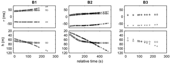 TDOAs and hydrophone depths during stations B1–B3 of the deep-water pinger localization experiment for front hydrophone (◦), rear hydrophone (+) and (×).