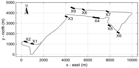 Vessel track on 7 June 2015 aiming at the localization of sperm whale X. The area corresponds to rectangle “X” in Figure 3. The drifting vessel positions during stations X1–X9 are marked by heavy lines.