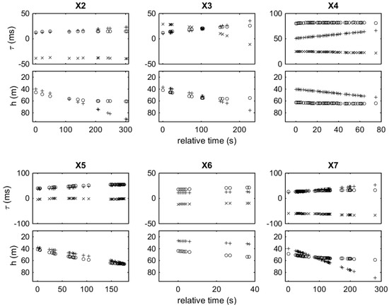 TDOAs of sperm-whale signals and hydrophone depths during stations X2–X7 of the deep-water experiment on 7 June 2015 aiming at the localization of sperm whale X for front hydrophone (◦), rear hydrophone (+) and (×).