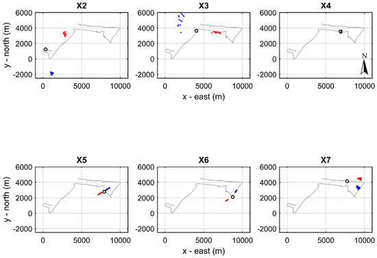 Estimated horizontal positions for sperm whale X during stations X2–X7; the two families of solutions are marked by dots of different color (blue and red). The vessel track and middle position during each station are marked by a light line and a circle, respectively.