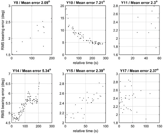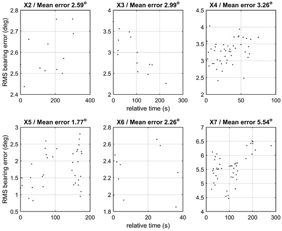 Figure 16 shows the estimated horizontal positions of whale X at stations X2 to X7 while Figure 17 shows the corresponding errors in estimating the azimuthal angle at each station using the simple bearing estimation approach [5]. In each panel of Figure 16, the position of the vessel in the middle of the station is marked by a circle superposed on the vessel track. The localization in the horizontal is subject to left–right ambiguity. The two symmetrical solutions with respect to the vertical plane through the two hydrophones are marked by the different colors. It is noted that the RMS errors shown in Figure 15 and Figure 17 are statistical errors describing the uncertainty of the localization results, not actual errors i.e., differences between estimated and true whale locations which are unknown.