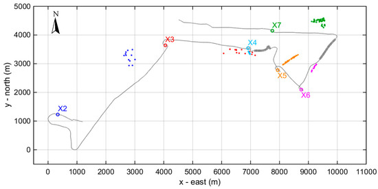 Combination of horizontal localization results for whale X from all stations. The vessel track (light line) is marked by thicker grey dots when the vessel is next to the whale while at surface between two deep dives (between X4 and X5 and between X6 and X7). The vessel location in the middle of each station is marked by a circle of different color—the same color is used for the corresponding localization results of the sperm whale (color dots).