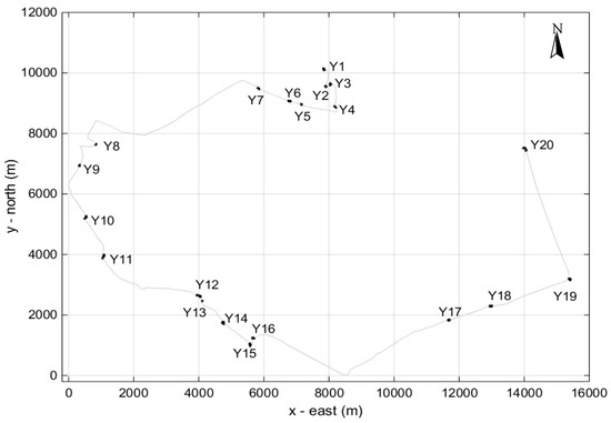 Vessel track on 8 June 2015 aiming at the localization of sperm whale Y. The area corresponds to rectangle “Y” in Figure 3. The stations (Y1–Y20) are marked by black dots.