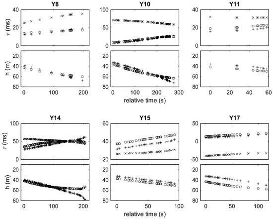 TDOAs of sperm-whale signals and hydrophone depths during stations Y8, Y10, Y11, Y14, Y15, and Y17 of the deep-water experiment on 8 June 2015 aiming at the localization of sperm whale Y for front hydrophone (◦), rear hydrophone (+) and (×).