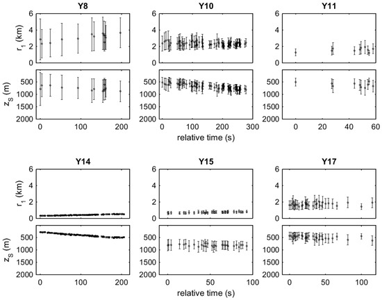 Localization results for source range (from front hydrophone) and depth for sperm whale Y during stations Y8, Y10, Y11, Y14, Y15, and Y17. The error bars about the estimated means (◦) indicate the posterior RMS errors.
