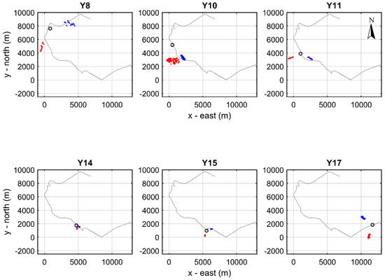 Estimated horizontal positions for sperm whale Y during stations Y8, Y10, Y11, Y14, Y15, and Y17; the two families of solutions are marked by dots of different color (blue and red). The vessel track and middle position during each station are marked by a light line and a circle, respectively.