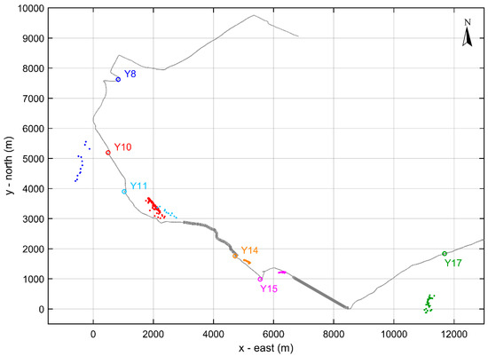 Combination of horizontal localization results for whale Y from all stations. The vessel track (light line) is marked by thicker grey dots when the vessel is next to the whale while at surface in-between two deep dives (between Y11 and Y14 and between Y15 and Y17). The vessel location in the middle of each station is marked by a circle of different color—the same color is used for the corresponding localization results of the sperm whale (color dots).