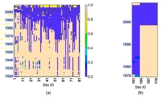 (a) Precipitation (81 stations), and (b) air temperature (10 stations) in situ data availability at the Lower Mekong Basin. The dark blue color (value of 0 or 0%) refers to a complete data record, while the beige color (value of 1 or 100%) refers to a complete missing data records during a specific year for a specific site.