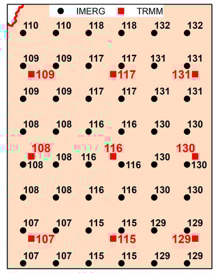 Daily cumulative precipitation data was obtained from the Global Precipitation Measurement mission (GPM) and the Tropical Rainfall Measurement Mission (TRMM) remote sensing data and used as inputs for the LMRB model. The Integrated Multi-satellite Retrieval for the Global Precipitation Measurement mission (IMERG) dataset used for this work was the GPM_3IMERGDF (https://pmm.nasa.gov/data-access/downloads/gpm). Since IMERG data products are only available from 12 March 2014 to present, we used the TRMM rainfall data (3B42RT) for time periods earlier than 12 March 2014. A nearest neighbor methodology was used to fill the IMERG data points with the TRMM data points as an approximation during the 1 March 2000 to 11 March 2014 time period, because the TRMM and IMERG data do not have the same spatial resolution (i.e., 0.25 and 0.1 degree respectively). The Euclidean or great circle distance was calculated between the TRMM and IMERG cell centroids to achieve filling data points. The minimum distance between the IMERG and TRMM points was used for the filling assignment. A layout showing part of the IMERG and TRMM cell points within the LMRB, labelled with identification numbers that reflect the assignment, is illustrated in Figure 3.