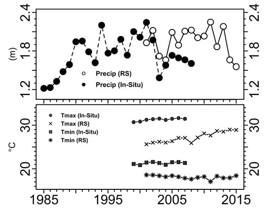 The average annual precipitation in the study watershed during 2001–2015 was 1.9 m (satellite-based remote sensing data products). The average maximum annual air temperature in the study watershed during 2001–2015 was 27 °C, while the average minimum annual air temperature during 2001–2015 was 18 °C (GLDAS data products). We also note here there is about 2 °C difference between air temperature estimates using GLDAS data products and in-situ station data products. We believe that in-situ air temperature station data does not represent the entire watershed accurately, since there is a bias attributed to location and availability. We summarize the precipitation and air temperature annual information for the study watershed from 1985–2015 in Figure 4.