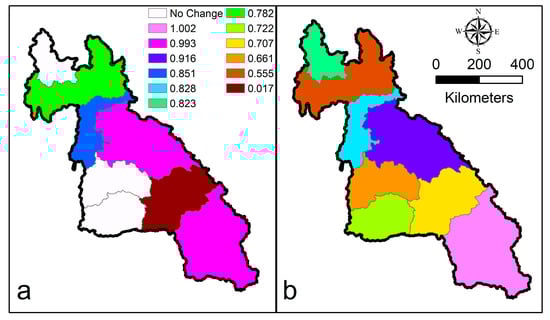 Our hydrological model showed higher sensitivity to parameters related to correction adjustment factors for precipitation forcing inputs. Figure 5 provides the LMRB model precipitation forcing adjustment factor layout for the in-situ and remote-sensing, satellite-based precipitation datasets. This layout could be used to guide the correction of TRMM and GPM earth observations for future applications in the region. Polygons with no change in precipitation forcing adjustment (i.e., shown in white color) indicate the non-existence of rain stations or rain station exclusion due to the incompleteness of data records (Figure 5a). This matches earlier observation seen in Figure 1 that there are a few number of rain stations over the LMRB. We note here that a sequential calibration procedure was performed starting from sub-basin outlet 1 and going downstream till sub-basin outlet 6 (sub-basins 7 and 8 are the western tributary outlets for the Mekong River and are draining to sub-basin 5). This has resulted in the production of the correction adjustment factor layout in polygons corresponding to sub-basin outlets. Figure 5 serves as a quality check for the precipitation forcing data in the LMRB when applied in hydrological applications. Precipitation forcing data from satellite-based remote sensing tend to be more skewed in the northern part of the LMRB in comparison with the southern part. In general, we found that running our model without satellite-based remote sensing precipitation data adjustments tended to overestimate the simulated discharge by about 13%.