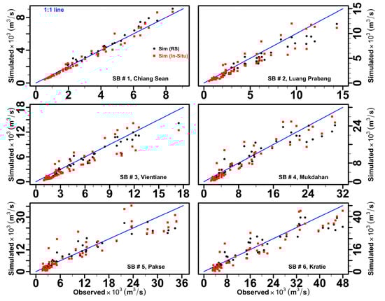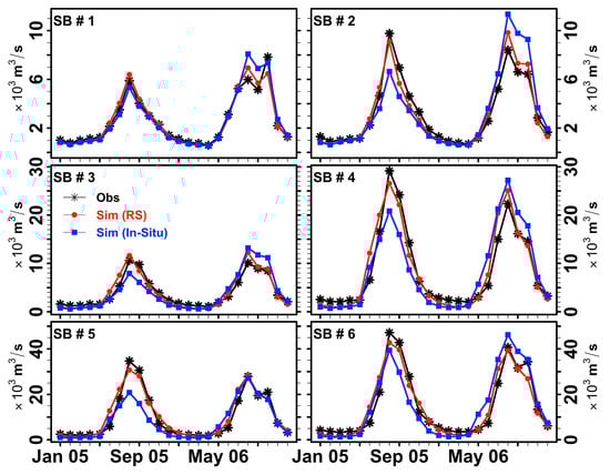 Figure 6 depicts the LMRB model performance during the calibration years (2005, 2006), driven by satellite-based remote sensing earth observations (blue rectangle) and in-situ (red circle) meteorological data at six watershed outlets within the Lower Mekong Basin. The simulated discharge results obtained from satellite-based remote sensing data were able to explain more than 91% of the variance observed in the monthly discharge during the calibration years (i.e., the Nash–Sutcliffe Efficiency (NSE) varied from 0.91 to 0.96 from sub-basin 1 to 6). The LMRB model performance when driven with in-situ data was able to explain from 68% to 91% of the variance observed in the monthly discharge during the calibration years. The LMRB model overestimated the monthly discharge by about 5% at sub-basin 5 and underestimated the monthly discharge by about 2% at sub-basin 6 during the calibration years when driven by satellite-based remote sensing data. Table 3 provides the calibration metrics used to assess the performance of the LMRB model when driven by satellite-based remote sensing and in-situ data. The percent error (Qerr) between the monthly mean simulated and observed discharge and the NSE performance metrics are tabulated for the LMRB model under satellite-based remote sensing and in-situ data (Table 3). We note here that the results shown in Figure 6 and Table 3 suggest that the simulated model discharges utilizing satellite-based remote sensing data inputs are able to capture the variability of the observed streamflow patterns in the Lower Mekong better than simulated model discharges forced with in-situ data. We also note that the Qerr at SB5 and SB6 (LMRB outlet) were higher than other outlets examined in the LMRB calibration work (Table 3). We think that the differences in Qerr among the sub-basins can be attributed to the sequential calibration method that we used in this work, and the interaction of the dam release rules observed in the basin. In summary, our LMRB model evaluation results are similar to previous attempts presented by Rossi et al. [], who reported Nash–Sutcliffe flow monthly efficiency values ranging between 0.8 and 1.0 at mainstream monitoring stations.