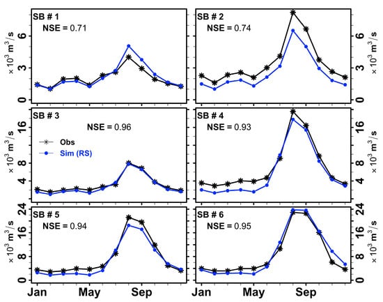 The LMRB model validation metric results. The LMRB model Nash–Sutcliffe Efficiency (NSE) performance metrics are depicted for each sub-basin corresponding to satellite-based remote sensing (RS) and in-situ data input, respectively.